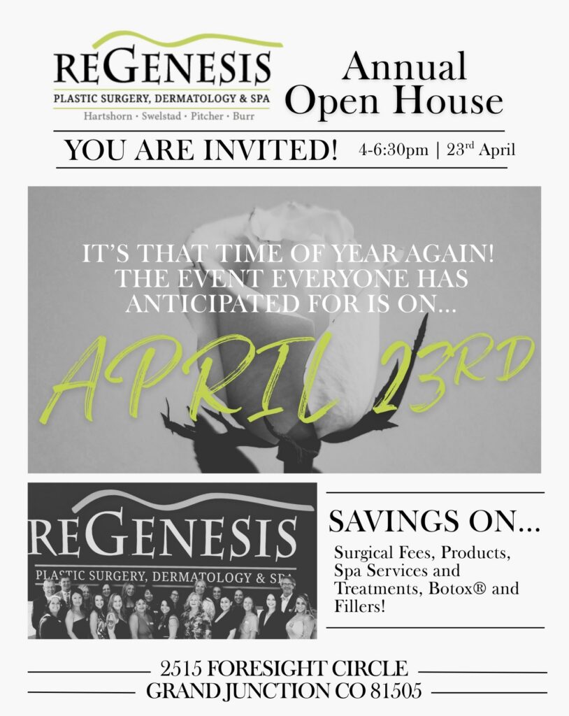 Our Annual Open House is April 23rd, 2026 from 4-6:30pm. This event is open to everyone current customers and new! Savings on Surgical Fees, Products, Spa Services and Treatments, Botox® and Fillers!